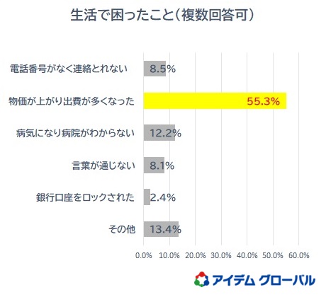 生活で困ったことを聞いたところ、「物価が上がり出費が多くなった」が最多で55.3%、次いで「病気になり病院が分からない」12.2%となった。物価上昇による出費増加が5割を超え、急激な物価上昇の影響が外国人材にも及んでいることが分かる。外国人材の多くは、母国にいる家族の家計を支えていることもあり物価高は死活問題となっている。