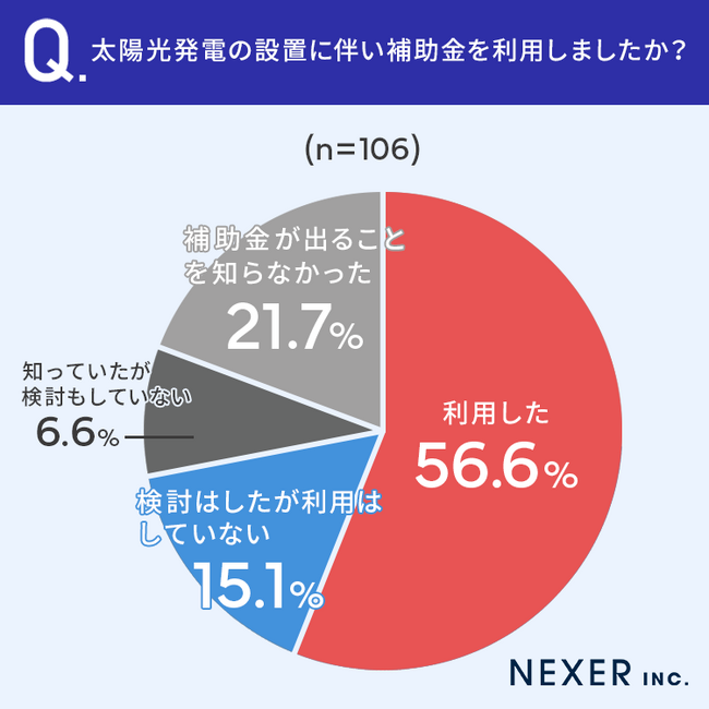 56.6%と半数以上の方が、太陽光発電の設置に伴い補助金を「利用した」と回答しています。