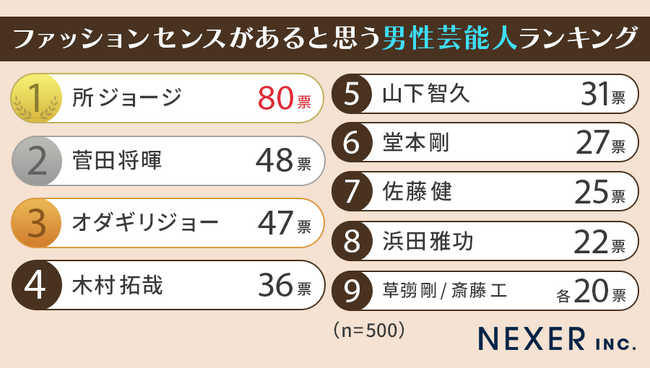 ということで「ファッションセンスがあると思う男性芸能人ランキング」は、以下のようになりました!