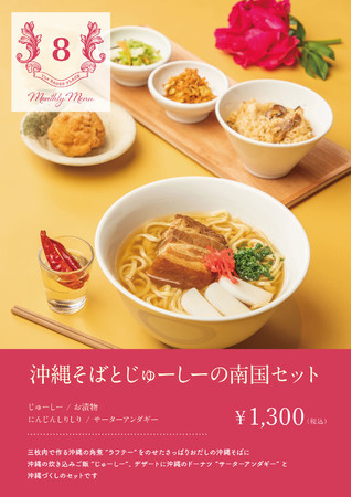 毎月シーズナルな料理を提供するランチマンスリーメニュー。8月は沖縄の代表的な料理をセットにした「沖縄そばとじゅーしーの南国セット」が登場。銀座にいながら沖縄グルメが味わえる期間限定メニューです。