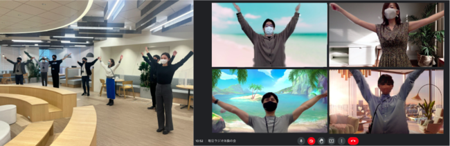 部活動の一つでもあるラジオ体操部と人事部門が連携し、社内で毎日ラジオ体操を実施しています。出社している人だけでなく、在宅勤務者もオンラインでつながり参加しています。 ラジオ体操の継続的な実施により、参加者からは「毎日継続することで代謝が上がり、悩んでいた肩こりが軽減された」「オンラインでも参加できるので、毎朝みんなと顔を合わせて健康を意識する習慣ができた」「みんなの士気が高まった」などの声が寄せられ、従業員の健康増進につながっています。