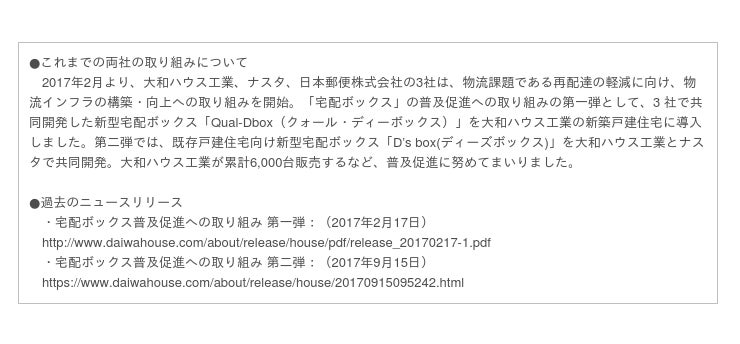 大和ハウス工業株式会社(本社:大阪市北区、社長:芳井敬一、以下「大和ハウス工業」)と株式会社ナスタ(本社:東京都港区、社長:笹川順平、以下「ナスタ」)は、スマートキーを搭載した戸建住宅向け宅配ボックス「Next-Dbox(ネクスト・ディーボックス)」 ・新型「D’s box(ディーズボックス)」を共同開発しました。