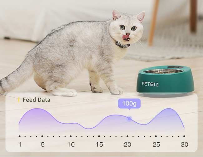 【餌の食べ過ぎを防ぐ/年齢・体重・品種で摂取カロリーの目安を表示/防水IP6&抗菌/iPhone・Android対応/ギフトに】スマートなペット皿です。