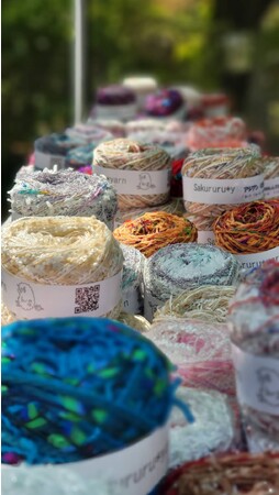 いろいろな素材・色・形の糸を組み合わせた、個性的な引き揃えの毛糸玉や、SDGsへの取り組みでもある房耳(ふさみみ)糸、「私のふさふさ」などを販売します。