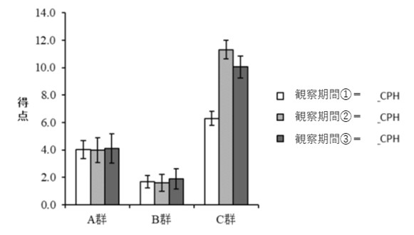 C 群の女性において、 観察期間1.よりも観察期間2.、3.の方があがりました。