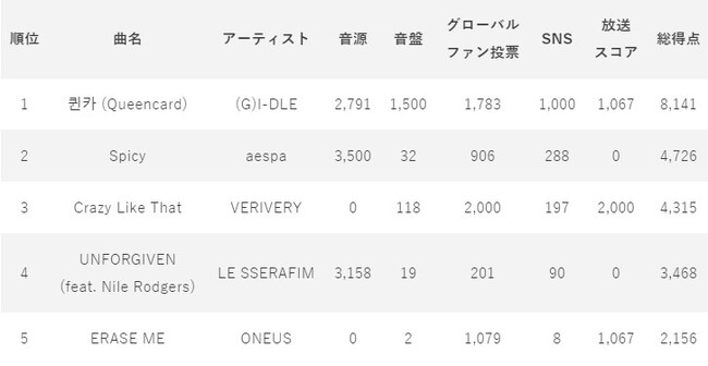 (※)各スコアの割合音源35%、音盤15%、グローバルファン投票(アプリ)20%、SNS10%、放送スコア20%