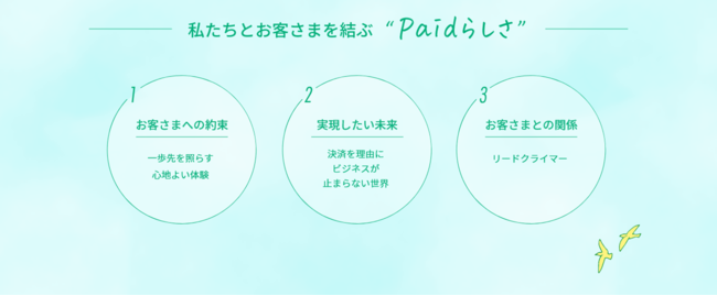 「Paid」は、企業間取引における後払い決済で発生する与信管理や請求書の発行、代金回収などの請求業務を全て代行するフィンテックサービスです。2009年に日本で初めてのBtoB専門決済サービス「SDペイメント」として提供を開始し、2011年に企業間決済「Paid」へとリニューアルしました。現在では累計契約社数シェアNo.1*の企業間決済サービスとして4,000社以上の企業に導入されています。これまで10年以上にわたり、「Paid」に関わるすべての人たちと共に培ってきた「Paidらしさ」をまとめ、お客さまとの関係性や、今後実現したい未来に向けた思いを3つのメッセージに込めました。