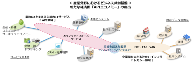 本サービスにより、これまで連携できなかった受発注情報、配送情報と業務プロセス情報などのデータ連携が可能となり、産業界の垣根を超えた、新たな経済圏である「APIエコノミー」の創出が可能になります。