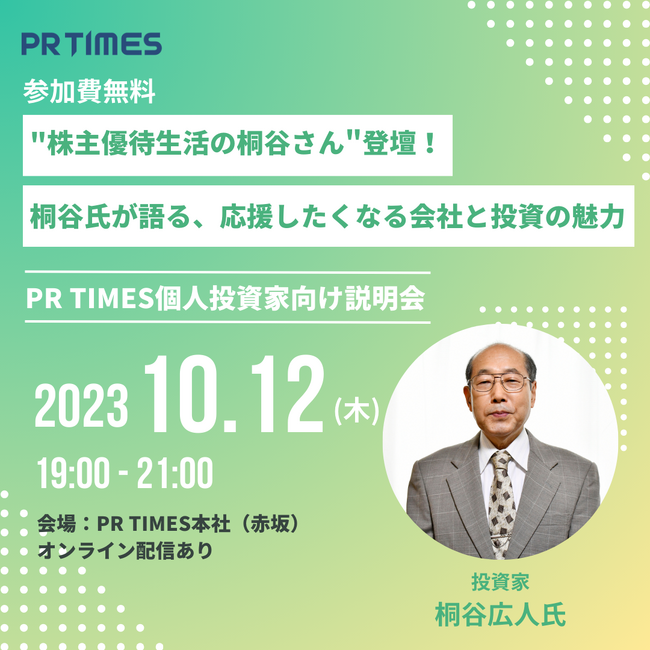 ”株主優待生活の桐谷さん”登壇!無料開催 PR TIMES個人投資家向け説明会10/12(木)実施