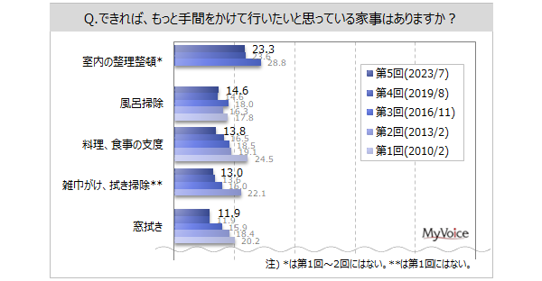 ■できればもっと手間をかけたい家事は、「室内の整理整頓」が2割強、「風呂掃除」「料理、食事の支度」「雑巾がけ、拭き掃除」が13〜15%。過去調査と比べて「料理、食事の支度」は減少傾向