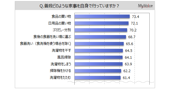男性の方が女性より上位のものは、「ゴミだし・分別」「風呂掃除」「掃除機をかける」です。反対に、「洗濯物をたたむ」「料理、食事の支度」「台所の掃除」は、女性の方が男性より上位となっています。