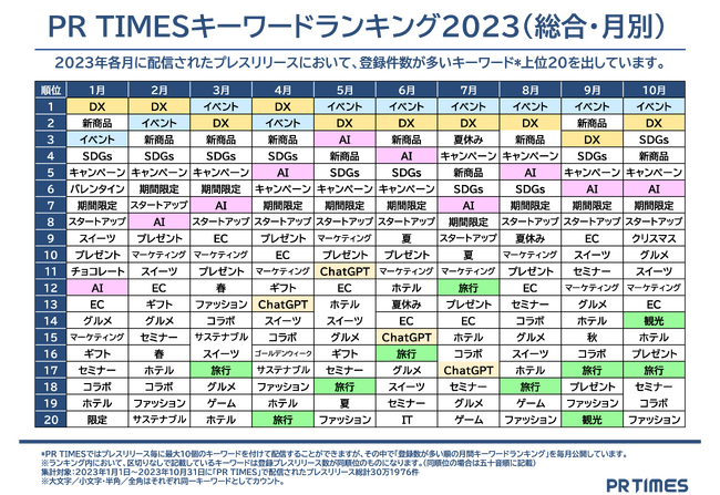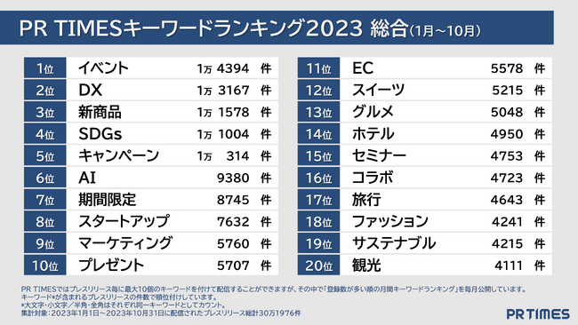 「PR TIMES」ではプレスリリース発表の際に、発表企業がプレスリリース内容に関係するキーワードを最大10個登録することができます。2023年1〜10月に発表された総計30万1976件のプレスリリースのキーワード登録総数は38万6710種に上りました。総合ランキングでは2023年の企業活動の潮流を、そして月別ランキング推移からは企業動向の変遷と流行の兆しをキーワードを通して分析しています。