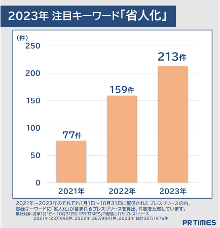 「省人化」は、2021年77件、2022年159件、2023年213件と年々その件数を増やしています。また、起因するように「人手不足」のキーワードが2021年120件、2022年212件、2023年505件とこの1年でも2倍超に件数を増やしており、キーワードランキングでも上位にランクインしているように「DX」の普及や「AI」の広がりがビジネスにもたらす業務効率化に伴い、「省人化」というキーワードが使用されると予想されます。