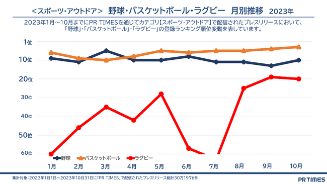 「野球」は国際大会が開催された3月に3位と年間を通じた最高順位となりました。8月〜10月にかけては、「バスケットボール」の国際大会開催からリーグ開幕が続き、順位を徐々に高める結果となりました。「ラグビー」についても、国内リーグ決勝が行われる5月(29位)と、国際大会が開催された9月〜10月(9月:19位、10月:20位)に向けては順位が上がりました。