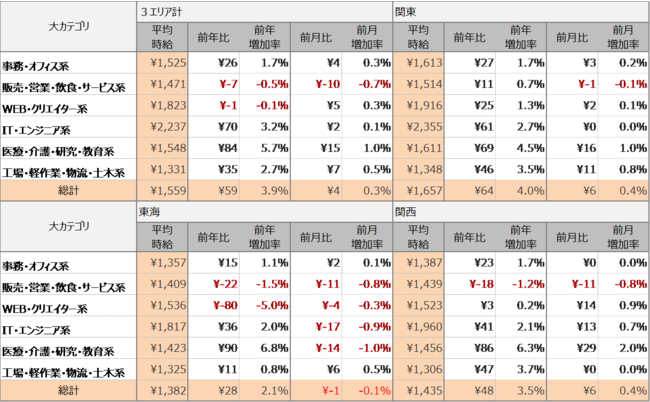 職種別の平均時給について、 「事務・オフィス系」は1,525円(前年比26円増、前月比4円増)、「販売・営業・飲食・サービス系」は1,471円(前年比7円減、前月比10円減)、「WEB・クリエイター系」は1,823円(前年比1円減、前月比5円増)、「IT・エンジニア系」は2,237円(前年比70円増、前月比2円増)、「医療・介護・研究・教育系」は1,548円(前年比84円増、前月比15円増)、「工場・軽作業・物流・土木系」は1,331円(前年比35円増、前月比7円増)となりました。