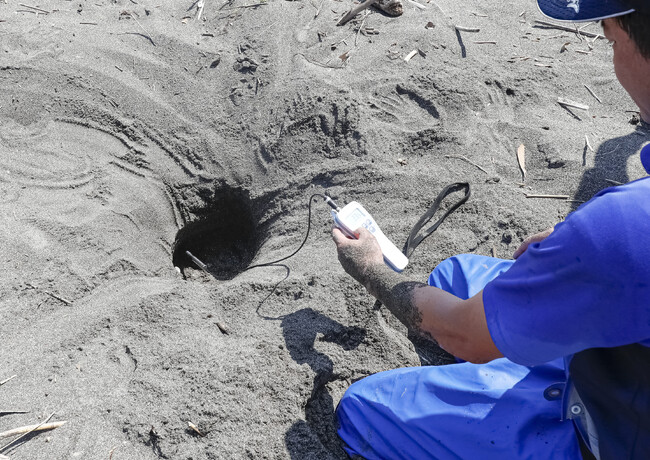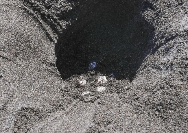 深さ約30〜50cmの砂の中に卵を確認しました。