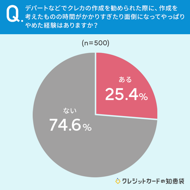 25.4%の方がデパートなどでクレカの作成を勧められた際に、作成を考えたものの時間がかかりすぎたり面倒になってやっぱりやめた経験が「ある」と回答しています。