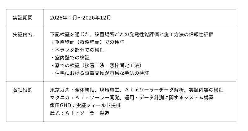 本実証では、飯田GHDが提供する日野市のモデルハウス(※3)を活用し、マクニカと麗光が開発・製造するAirソーラーを、東京ガスが開発する施工方法により設置し、設置場所ごとの発電性能の評価、施工方法の信頼性評価を行います。東京ガスは、これまでの太陽光発電に関する研究や事業で培ってきた施工・解析技術を本実証に転用します。マクニカは、これまでのペロブスカイト太陽電池に関する実証事業で培った豊富なノウハウを活かし、本実証へ技術力を提供します 。