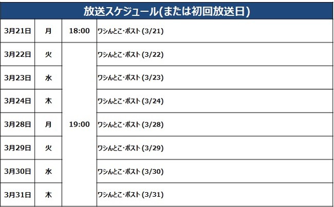 初回放送の3月21日(月)は、18時〜21時までの1時間拡大版になります。