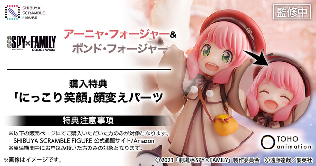 株式会社CyberZ(本社:東京都渋谷区、代表取締役社長:山内隆裕)の連結子会社、株式会社eStream(本社:東京都渋谷区、代表取締役社長:高井里菜)が手掛けるフィギュアブランド「SHIBUYA SCRAMBLE FIGURE」(通称「渋スクフィギュア」)は、『劇場版SPY×FAMILY CODE: White』より、「アーニャ・フォージャー&ボンド・フォージャー」の予約受付を本日2023年12月22日(金)11:00より開始いたしました。購入特典として、ショップ別の顔変えパーツが付いてきます。