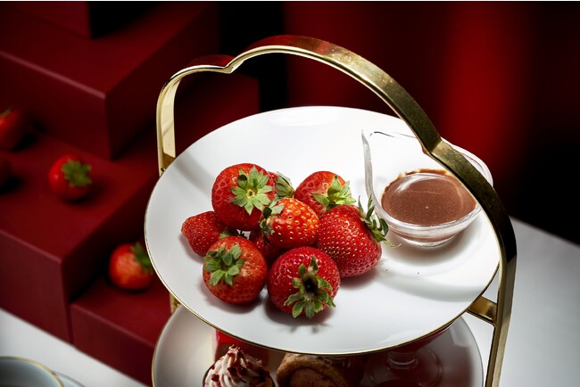 「ルージュ」をテーマに、真っ赤ないちごづくしのアフタヌーンティー。アフタヌーンティー上段は、新鮮で瑞々しいいちごを、そのままでもお好みでチョコレートソースをつけて贅沢にもお楽しみいただけます。