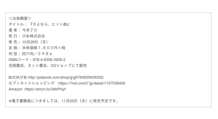 ぴあ株式会社(代表取締役社長 矢内 廣)は、音楽プロデューサー今井了介著『さよなら、ヒット曲』を