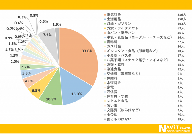 「値上げによって一番困るものは何ですか?」という質問については、「電気料金」が33.6%、「生活用品」が15.0%、「灯油・ガソリン」が10.3%という順になりました。