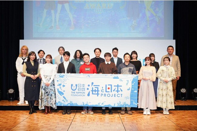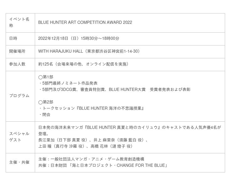 一般社団法人マンガ・アニメ・ゲーム教育創造機構は、「海洋未来」をテーマにした『BLUE HUNTER(ブルーハンター)アートコンペティション』の授賞式、『BLUE HUNTER ART COMPETITION AWARD 2022』を2022年12月18日(日)にWITH HARAJUKU HALLで開催いたしました。世界20ヵ国以上、711作品の中から大賞に選ばれたのは日出木陽太さんの作品「ドルフィンスーツ」。青二プロダクションの人気声優4名をゲストに迎え、海洋専門家による授業形式のトークセッションも行いました。このイベントは、日本財団が推進する海洋ごみ対策プロジェクト「海と日本プロジェクト・CHANGE FOR THE BLUE」の一環で開催しました。