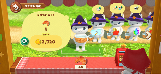 イベント期間中、またたび商店には、魔法使いをイメージした帽子を被ったにゃんこ達がアイテムを買いにやってきます。今しか見られない風景をどうぞお楽しみください!