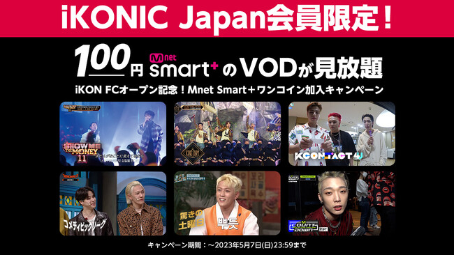 100%韓国エンターテインメントチャンネル「Mnet」および韓国エンタメ動画配信サービス「Mnet Smart+」を運営するCJ ENM Japan株式会社(本社:東京都港区、代表取締役:崔起容〔チェ・ギヨン〕)は、iKONの日本公式ファンクラブ「iKONIC Japan」のオープンを記念して、“Mnet Smart+100円加入キャンペーン”を本日12:00より開始しますので、お知らせいたします。