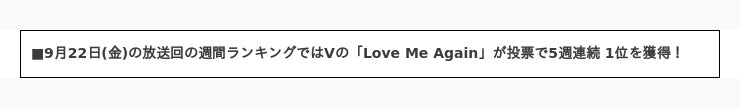 『IDOL CHAMP presents POP-K TOP10 Friday』9月22日(金)の放送回において、Vの「Love Me Again」が、チャート投票で5週連続で1位を獲得し、今週のNo.1曲として番組内で放送されました。