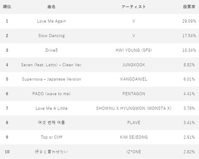 『IDOL CHAMP presents POP-K TOP10 Friday』9月の放送回の総合投票数で決まる月間1位はVの「Love Me Again」となり、9月のMVPとして番組内で放送されました。「IDOL CHAMP」のファン投票では表示の結果となりました。