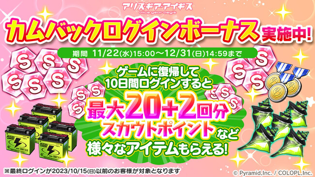 「最終ログインが2023年10月15日(日)以前のお客様」が対象となる、カムバックログインボーナスが開催中です。