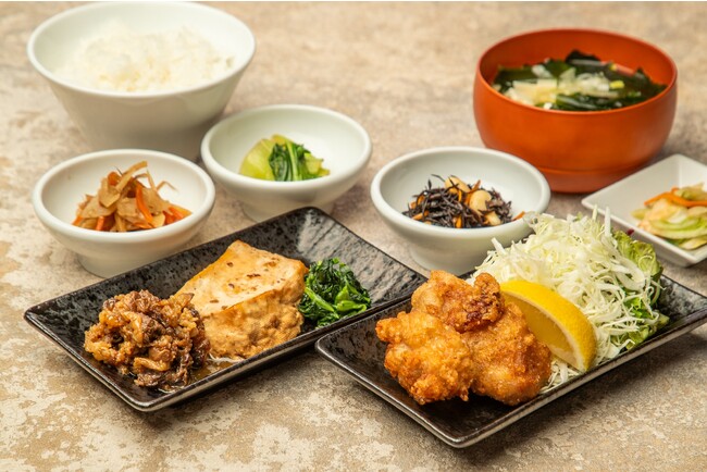 鶏の唐揚げと肉豆腐のおばんざい定食 1,100円(税込)(ひじきの煮物・きんぴらごぼう・青梗菜のオイスターソース炒め お漬物・ごはん・お味噌汁)