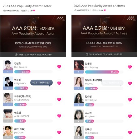 株式会社ゲームオン[本社:東京都渋谷区、代表取締役:李一守(リ・イルス)] が運営のK-POPアイドル応援アプリ『IDOL CHAMP』において、「2023 Asia Artist Awards IN THE PHILIPPINES(2023 AAA)」のファン投票部門「AAA人気賞」の投票を開始しました。投票部門は俳優部門「AAA男優人気賞」「AAA女優人気賞」、歌手部門「AAA男性歌手人気賞」「AAA女性歌手人気賞」の4部門。現在『IDOL CHAMP』において各投票部門のファン投票を受付中です。投票は予選と決戦投票が行なわれ、11月30日まで投票を受付中です。