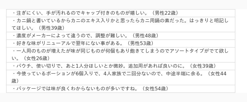 市販の鍋つゆ購入時の重視点は(複数回答)、「味」が利用者の80.5%、「価格」が46.2%、「タイプ」「賞味期限・消費期限」「メーカー」が15〜16%となっています。