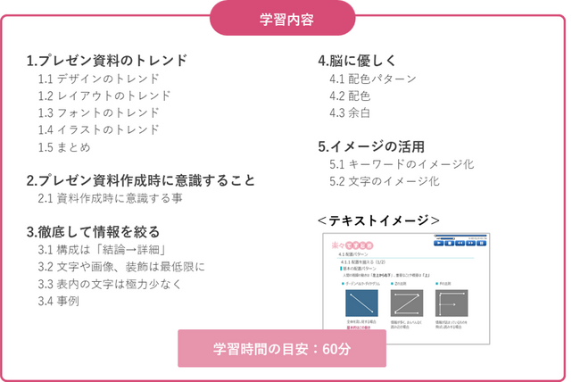 本コンテンツの提供により、デザインの基本や資料作成のコツの理解、わかりやすく伝わりやすいプレゼン資料を作成するスキルの習得と、確認テストによる定着を促し、ユーザーのプレゼン資料作成力の向上を支援します。
