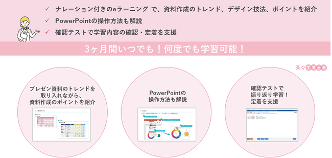 「伝わるプレゼン資料作成ガイド デザインの技法」は、プレゼン資料作成のデザイン技法やポイント、PowerPointの操作方法を習得するeラーニングコンテンツです。マイクロメイツが業務マニュアル作成や各種教育コンテンツ作成の実績で培ってきた「資料作成技術」や「わかりやすく伝える表現」のノウハウを、学習・テスト・アンケートが1つになったクラウド型eラーニングシステム「楽々てすと君」※1を使用して提供します。