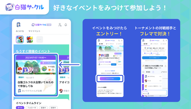 『白猫サークル』では簡単にイベントの主催参加ができるのでプレイヤーの皆さんが決めたルールでゲームを遊べます。『白猫』が好きな皆さんで一緒に遊び盛り上がっていきましょう。