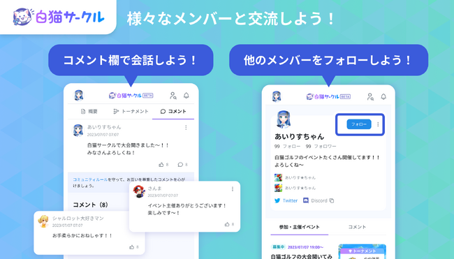 『白猫サークル』は、”みんなでやろうよ!”をコンセプトにしたコミュニティサービスです。イベントの主催や参加、コメント欄での交流を通じて、ファン同士でより気軽にゲームをお楽しみいただけます。現在、スマートフォン向けゲーム『白猫テニス』や『白猫GOLF』など、『白猫』シリーズのファンである皆さまに向けて運用しております。この度『白猫テニス』での運用が軌道に乗ったため、『白猫GOLF』を対応ゲームに追加いたしました。