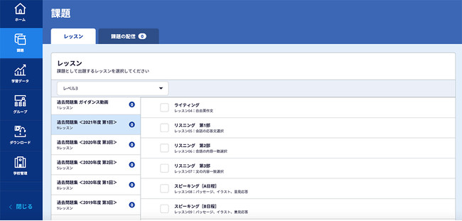 中学校・高校向けに提供している『スタディサプリ ENGLISH』では、楽しく継続して学習できる「中高生英会話コース」と、英語の4技能をバランス良く鍛え英語民間検定試験の対策ができる「英語4技能コース」を展開しています。このたび、「英語4技能コース」において、英検(R)試験前の直前対策ができる教材が欲しいという学校現場からのニーズに基づき、英検(R)3級〜準1級までの4レベルにおいて、過去5回分の過去問題の提供を開始致します。解答・解説だけでなく間違えやすいポイントなど知っておきたいTipsも提供し、試験対策が可能となります。生徒は、テキスト教材を別途購入する必要がなく、追加の費用負担なしで過去問の演習に取り組むことができ、Webブラウザ・アプリの両デバイスから学習することが可能です。さらに先生は、実施年度・受験回ごとに、各技能の出題形式別で、過去問を課題として配信することができ、学習データ画面から取り組み状況や正解率が把握できます。