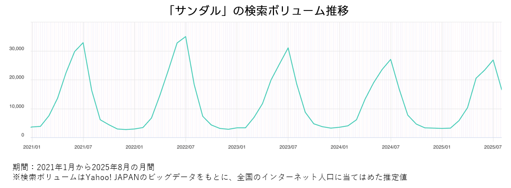 「サンダル」の検索数は毎年7月がピーク