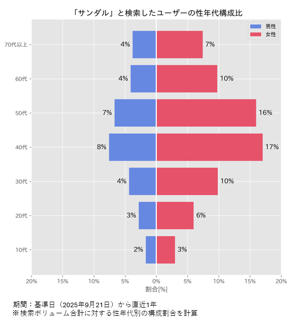 集計期間:2025年9月21日から直近1年 ※検索ボリューム合計に対する性年代別の構成割合を計算