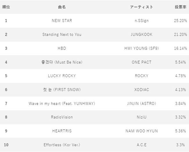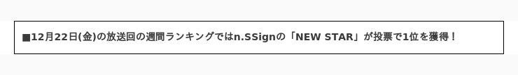 『IDOL CHAMP presents POP-K TOP10 Friday』12月22日(金)の放送回において、n.SSignの「NEW STAR」が、チャート投票で1位を獲得し、今週のNo.1曲として番組内で放送されました。