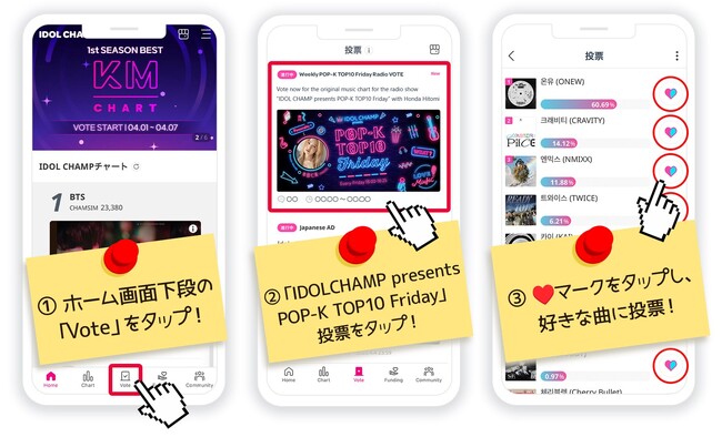 金曜日の夜。あなたの投票で決まるK-POPアイドルのオリジナル・チャートをカウントダウン形式でお届けする音楽番組!K-POPアイドル応援アプリ「IDOL CHAMP」の投票機能と連動し、リスナーの投票をもとにお送りします。