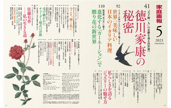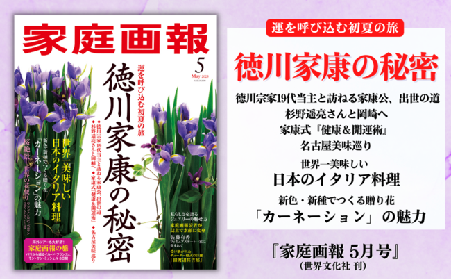 株式会社世界文化社は、『家庭画報 5月号』を4月1日(土)に発売します。今号は「徳川家康の秘密」と題し、話題の「徳川家康」を紐解きます。 徳川19代目当主・家広さん、NHK大河ドラマで榊原康政を演じる杉野遥亮さんが登場し、さまざまな角度から平和を希求した天下人の魅力に迫ります。また、進化し続ける日本のイタリア料理、母の日の代名詞“カーネーション”の最前線をご紹介します。