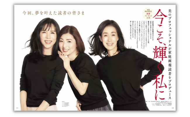 家庭画報の年間購読者のかたが誌面に登場することのできる、集部からの特別なプレゼント企画。「もっと似合うヘアスタイルを見つけたい」「自分らしく、そして今どきのメイクをしたい」「いつものファッションをアップデートしたい」。そんな願いを撮影やヘア、メイク、スタイリングのプロフェッショナルが叶えます。たくさんのご応募者の中から選ばれた3名のかたがたの新しい魅力を引き出しました。