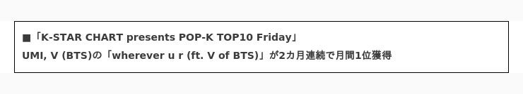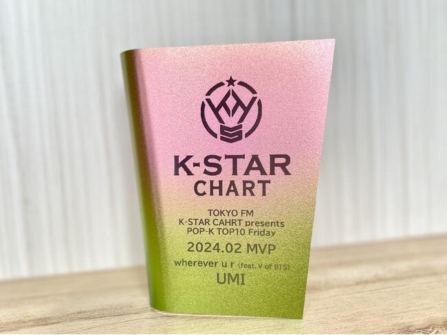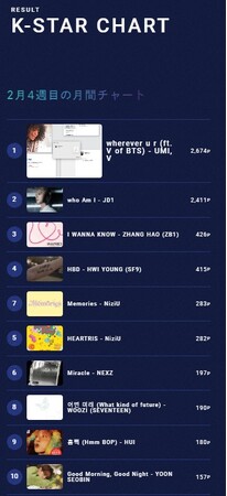 『K-STAR CHART presents POP-K TOP10 Friday』週間チャートの投票数をベースに算出された2月の累計ポイント数で決まる月間チャート1位はUMI, V (BTS)の「wherever u r (ft. V of BTS)」となり、2月のMVPとして番組内で放送されました。