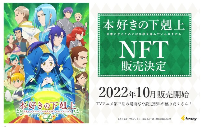 また、記念すべき第一弾として、テレビアニメ「本好きの下剋上〜司書になるためには手段を選んでいられません〜(第三期)」の場面写(*1)と設定画(*2)を組み合わせたNFT(代替不可能なトークン)の販売開始をお知らせいたします。(*1)1シーンの静止画像 (*2)人物(キャラ)やメカなどの設定を説明したイラスト