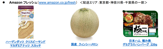 Amazonは、Amazonプライム会員向けサービスとして、東京・神奈川・千葉の一部エリアにおいて「Amazon フレッシュ」( http://www.amazon.co.jp/fresh )を、食品スーパー ライフとの協業により、東京・神奈川・埼玉・千葉・大阪・京都・兵庫の一部エリアにおいてライフネットスーパー( http://www.amazon.co.jp/life )を、スーパーマーケットバローとの協業により、愛知の一部エリアにおいてバローネットスーパー( http://www.amazon.co.jp/valor )を、スーパーマーケット成城石井との協業により、東京・神奈川の一部エリアにおいて成城石井ネットスーパー( http://www.amazon.co.jp/seijoishii )をAmazon.co.jp 上でそれぞれ展開しています。各ストアで取り扱う生鮮食品や惣菜をご注文から最短約2時間で Amazon がお届けし、対象エリアの Amazon プライム会員のお客様にご好評いただいております。